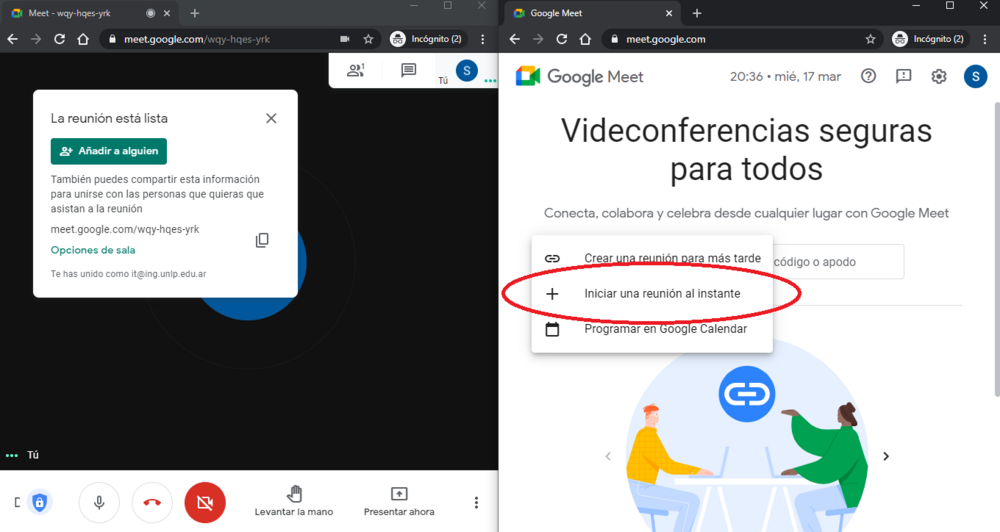3) Abrir una nueva pestaña (o ventana) en el navegador. En ella, ingresar nuevamente a la cuenta de Google Meet e iniciar una nueva reunión.